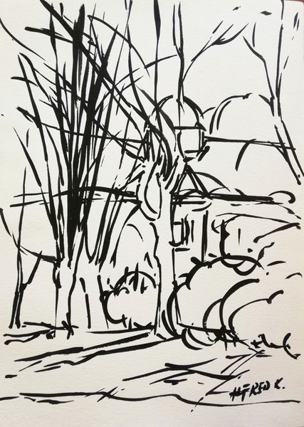 Editor: This is Alfred Freddy Krupa's "The tower at the falls on the river Korana," a drawing made with ink in 1993. The stark black lines against the white paper give it a feeling of urgency, almost like a memory fading. What do you see in this piece? Curator: I see a landscape wrestling with its own representation. Krupa created this work during the turmoil of the Balkan conflicts. The Korana River, flowing through a region marked by ethnic tensions, becomes more than just a geographical feature. What appears to be a simple scene transforms into an observation about imposed borders and contested identities, wouldn't you agree? Editor: I hadn’t thought about the political landscape at all! So, the starkness isn’t just aesthetic. Curator: Precisely! The almost brutal application of ink captures a sense of fragmentation mirroring the sociopolitical climate of the time. How do you read the image’s reflection on the water? Does it provide clarity or further obscure the scene? Editor: It definitely adds to the obscurity. The reflection almost feels like another layer of chaos. So the abstraction here could symbolize the distortions of reality experienced during conflict? Curator: It could. And the ladder depicted near the water... does it provide access or is it broken? Perhaps this element reflects the failed promises and infrastructure that existed within the region during its period of strife. Editor: Wow, I definitely have a different perspective on it now. Thanks for showing me the historical context behind the visual chaos. Curator: The historical background invites us to question the narratives around the work itself, but the real impact stems from allowing it to initiate critical dialogue regarding our own social experiences and shared humanity.