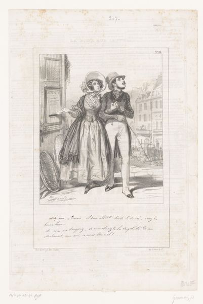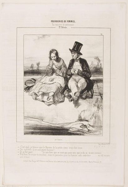 This print by Paul Gavarni presents a man and a woman by the water's edge, both preoccupied with consuming nuts. The act of eating, especially together, has ancient roots as a symbol of communion and shared experience. Consider the shared meal in the Last Supper, or the ritualistic consumption of food in various religious ceremonies. Here, however, the mundane act of eating nuts takes on a different tone. It lacks the spiritual weight of those earlier depictions, yet the underlying theme of shared sustenance remains. The woman, head bowed and hands engaged, embodies a certain vulnerability, a posture reminiscent of figures in mourning or deep contemplation. Over time, such gestures evolve, shedding their overt religious connotations but retaining a connection to the human psyche. We see echoes of these postures in modern depictions of grief or introspection. Gavarni captures a fleeting moment, transforming a simple act into a tableau of human interaction and emotion, reminding us that even the smallest details of our daily lives are laden with history and meaning.