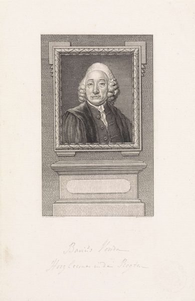 Editor: This is "Portret van professor Adriaan Kluit," an engraving made sometime between 1787 and 1828, attributed to Ludwig Gottlieb Portman, now hanging in the Rijksmuseum. The tight, symmetrical composition is quite striking; it gives the portrait a very formal feel. How do you interpret the piece from a purely visual perspective? Curator: Precisely, it’s a structured engagement. The framing device immediately establishes order—an oval within a rectangle, a deliberate containment of the subject. Consider the texture achieved through the engraving technique; the varying densities of lines create both form and light. What do you observe about the light’s fall? Editor: I see that the light is focused mainly on the face, particularly the forehead, drawing my attention there first. Then, it casts deep shadows under his wig and along the sides of his face. It gives him a stern look, but I am interested to know, does that contrast of light do something to his position in the piece? Curator: It is structuring the composition: It is a strategic deployment that adds volume and definition. Observe how the starkness is somewhat softened by the curvature and fine detail of the wig. It introduces dynamism within this rigorous format. How might you consider the visual effect of the clothing? Editor: The clothing is plain, almost blending into the darker background. I’m guessing it helps to put the spotlight on the face, so the eye isn't distracted. This is how Portman can direct you where he wants you to focus, but also give this professor prominence by directing light on his forehead. Curator: Correct. And the clean lines reinforce the portrait's intellectual nature and avoid opulent distraction, as neoclassicism shuns flamboyance. Thinking structurally, this ensures the composition supports, rather than detracts, from the work's meaning. Editor: That makes so much sense; focusing on the lines and structures lets you dig into its meaning without all the noise of historical context, which makes it approachable and interesting. Curator: A useful and revealing practice in all your visual examinations.