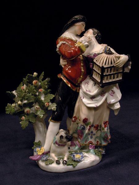 Editor: Here we have a porcelain sauceboat from around 1733 to 1743, crafted by the Meissen Manufactory. It depicts a swan entwined with a cherubic figure, and it's surprisingly ornate. The scale is quite small, yet the detail is incredible. What catches your eye about this piece? Curator: The primary aspect that draws my attention lies in the sophisticated manipulation of porcelain as a medium to convey both form and texture. The swan's plumage, meticulously rendered, contrasts with the smooth, almost glossed surface of the cherub's skin. How do you perceive the balance of these contrasting textures? Editor: I notice that contrast now that you point it out. The rougher texture of the swan versus the smoothness of the cherub definitely gives each figure a unique feel. Do you think that's just to create visual interest? Curator: While the visual interest is certainly a byproduct, the intention may delve deeper into exploring the material capabilities of porcelain itself. The Rococo style, which is in evidence, sought to demonstrate technical virtuosity. The interplay of light across these varied textures also introduces a dynamism to the piece. The careful execution invites semiotic interpretation. Editor: Semiotic interpretation? How so? Curator: Consider the swan, a symbol often associated with grace and purity, juxtaposed with the cherub, a representation of love and innocence. How do these figures, through their positioning and rendering, contribute to the work's overall message and aesthetic harmony? Editor: I hadn’t considered the positioning before, but I see what you mean. The swan’s protective pose towards the cherub suggests a narrative, amplified by the texture. Curator: Precisely. By carefully examining the formal elements, we unlock a richer understanding. It reveals a confluence of technical skill and symbolic intent, transcending mere function. Editor: Looking closely has shown me how every element is placed with intention. Curator: Indeed. Attending to structure illuminates function and enhances aesthetic contemplation.