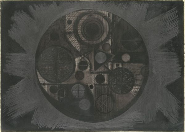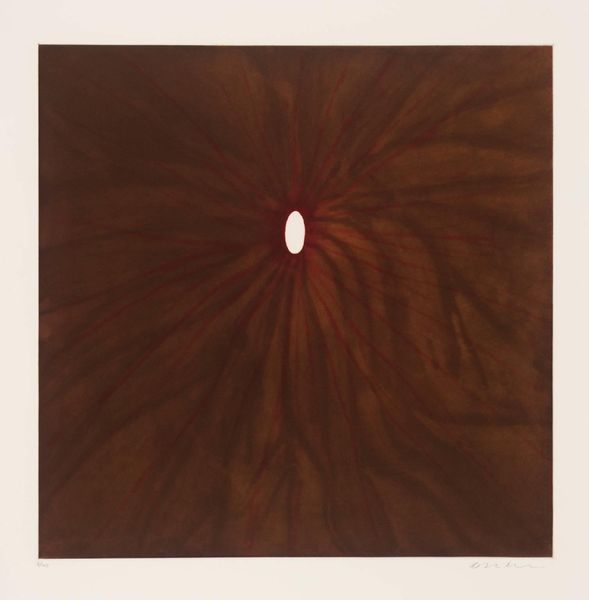 Curator: Before us is a work by Shirazeh Houshiary, held in the Tate Collections. Note the square format, roughly 60 centimeters in both dimensions. Editor: It’s immediately striking how meditative the piece feels; the color is so rich, like gazing into deep water. Curator: The artist is known for her exploration of breath and the unseen. She often uses minuscule marks to create a sense of pulsating energy. This is apparent in the concentric circles and what seems to be a floral shape at the very center. Editor: It reminds me of mandalas and spiritual art traditions where geometry serves to represent the cosmos. Houshiary often blends Eastern and Western philosophies. Curator: Indeed. She engages with ideas of emptiness and presence, using subtle gradations of tone to create a sense of depth and movement. Editor: Looking at it again, the texture almost seems to dissolve before your eyes, like a whisper. It evokes a sense of ephemerality. Curator: A profound piece that challenges our perception of form and space, reminding us of the unseen forces that shape our world. Editor: Absolutely. It’s an image that resonates long after you turn away, encouraging introspection.