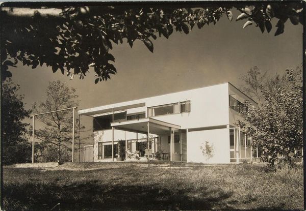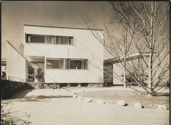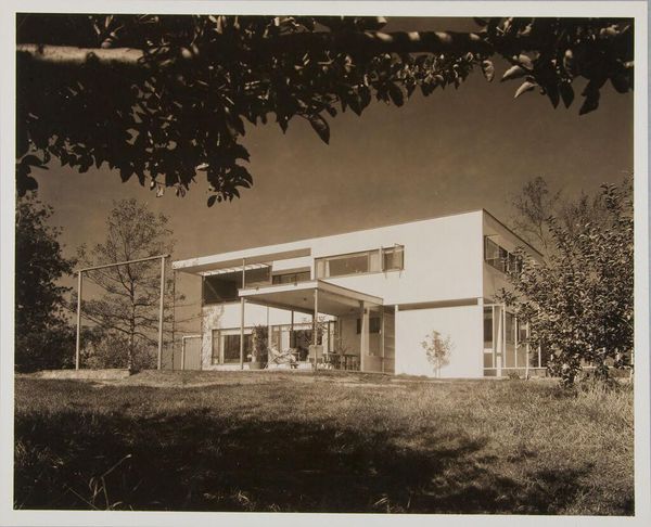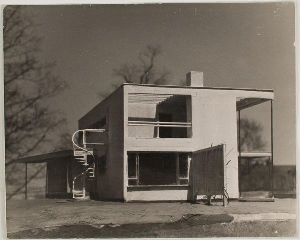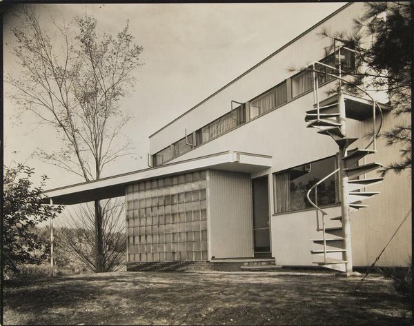 Curator: This is Paul Davis' photograph of Walter Gropius' residence in Lincoln, Massachusetts, taken in 1938. The house itself is a landmark of modernist architecture. Editor: It appears so stark, almost desolate, in this image. The geometry is so clean, so absolute, yet the overall feeling is sterile and unwelcoming. Curator: The Bauhaus aesthetic, of course. Davis’s photograph captures its essence—the interplay of rectangular forms, the emphasis on function over ornamentation. Look at the external spiral staircase, a purely functional element presented as visual poetry. Editor: Indeed. It's fascinating how the raw materials—concrete, glass, steel—are celebrated rather than concealed. You see the labor involved, the intentionality of stripping away the superfluous. Curator: Precisely! The composition is a testament to the beauty of geometric simplicity. It's about the relationship of shapes. Editor: And about reshaping domestic space. Thanks to Davis’s photograph, we get a glimpse of the revolutionary impact of modernism. Curator: Absolutely. It provokes questions about form and its relationship to function and meaning. Editor: It certainly highlights the impact of materials in shaping not just our buildings but also our lives.