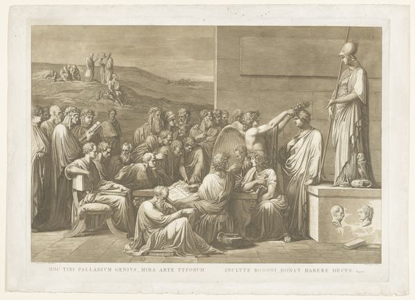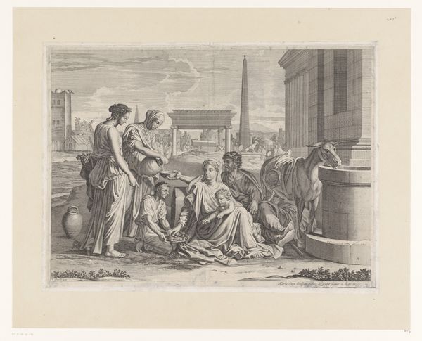 Curator: Gazing upon "The Holy Family in Egypt," etched sometime between 1656 and 1706, the scene feels like a whisper of antiquity captured in monochrome. What do you feel emanating from it? Editor: Intrigue, mainly, but also a palpable stillness. I'm immediately struck by the composition. It seems meticulously crafted. You have this foreground with the Holy Family contrasted with the implied labor evident with the people bustling in the distant Egyptian architecture, this work really captures an expansive, epic sweep. Curator: It is by Étienne Gantrel, after all. He seemed to infuse a unique dramatic storytelling to familiar biblical narratives. Do you perceive this drama here, with Mary, Joseph, and Jesus taking refuge? I find a serenity in it, a hopeful pause in a desperate journey. Editor: Gantrel did such exquisite, finely wrought labor, using the etching medium. I can practically feel the ink embedded in the paper; consider how his skilled hands could bring such delicate precision from such potentially crude materials like the etching needle and acid. He has certainly captured a historical interpretation here in an innovative display. The artist creates an engaging space with just those gradations of monochrome ink! I can't even imagine how someone dreams up so much complexity. Curator: Complex, yes! Observe how the landscape and architecture itself seems to mirror and embrace the human forms, wrapping the figures within history itself. Notice how both ancient Roman, Hebrew, and Egyptian culture can somehow simultaneously and symbolically exist together. Perhaps the goal isn't so much accuracy, but, instead, a deep meditation on universality and escape. Editor: It almost feels like a pre-industrial advertisement promoting religious life to upper-class aristocrats! Engravings such as these became quite widespread because it became reproducible, right? Though it has an accessible look, prints and engravings like these allowed even illiterate and working class Europeans the option of participating with the church! Who needed illuminated manuscripts at that point? Curator: Exactly! Mass production techniques democratizing artistic and religious access! I appreciate you grounding us back to earth, truly. Thank you, and perhaps some viewers can think further about how the mundane material components contribute so meaningfully to the divine, and universal spiritual yearnings of human existence. Editor: The social and art historical importance and impact of this type of artistic work is not something to forget! Thank you, and perhaps more viewers will get to be inspired to consider the relationship between art, commerce and belief!
