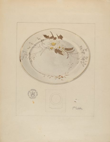 Curator: This is Joseph Sudek's "Saucer," created around 1937. It’s rendered beautifully in watercolor and drawing on paper, a tender tribute to…well, a simple dish. What leaps out at you initially? Editor: It has such a delicate presence. I notice the almost ghost-like outlines below the saucer, as though Sudek is referencing its factory mold. Also, the decoration, all repeated stylized florets and roundels in dark blues, hints at industrial, even global, distribution networks. Curator: Indeed! It’s like he’s pulling back the curtain on the everyday. I see in this not just a saucer but a symbol, perhaps a memory. His works often felt deeply personal. The rendering gives it a gentle glow as if it carries history inside. Editor: Precisely. Consider the labor – the hand that painted the watercolor and also perhaps, potentially, decorated many copies of the same design in the manufacture process itself. Are these acts of aesthetic creation and of functional industry so radically different? And how might the global porcelain production network influence local or national identity? Curator: Such potent questions! For Sudek, even mundane objects whispered of unseen narratives. A table by a window becomes a stage for light and shadow, just as here a mass-produced ceramic becomes intensely individual. Editor: The object is never alone, but tied up to complex and contradictory social and material dynamics. Porcelain has often traveled vast distances and been exchanged among diverse markets. I'd also be very curious about the particular manufacturer Sudek might have had in mind. Curator: So much is unsaid and suggested through form. Thank you for emphasizing the economic forces humming within the ordinary, its capacity for beauty—a soft grace noted where function might normally reside! Editor: My pleasure! Thinking about art always makes me want to reconsider value itself, and its making in the world.