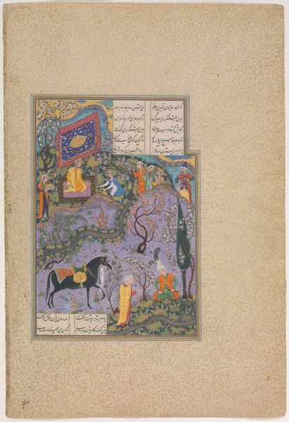 Editor: This watercolor, "Shaikh Mahneh and the Villager" from "Language of the Birds," dates roughly from 1462 to 1512. I’m struck by the detailed depiction of everyday life within such a confined space. How do you interpret the significance of the activities depicted in this miniature painting? Curator: I see a constellation of archetypes playing out in a timeless narrative. The shaikh represents spiritual authority, while the villagers embody the mundane world of labor. Their interactions become symbolic. Consider the oxen: are they merely beasts of burden, or do they also symbolize earthly desires that tie us to the material plane? Editor: That's fascinating! The contrast between the refined shaikh and the working villagers does seem to highlight different planes of existence. Are the colors symbolic as well? Curator: Absolutely. The earthy tones associated with the villagers—browns and muted greens—contrast sharply with the richer blues and reds of the Shaikh’s garments, hinting at a higher spiritual state. This palette reinforces a hierarchy of experience, a striving for transcendence amidst the ordinary. Do you see any visual cues suggesting that upward movement? Editor: Yes! Now that you point it out, the scene feels divided, with the villagers below and the shaikh presiding above, almost like ascending a mountain. The tree is rooted on the bottom but then flowers in the elevated space... Curator: Precisely! This reflects a key theme in Sufi mysticism: the soul’s journey towards enlightenment. The visual symbolism acts as a mnemonic device, guiding the viewer towards contemplation of the divine. Editor: This really opens my eyes to a new layer of meaning! I initially just saw a snapshot of daily life. Curator: And now you perceive a map of the soul! Art provides pathways of visual associations that embed in cultural memory over generations. It's why we revisit these images, each time deepening our connection to the wisdom they carry.