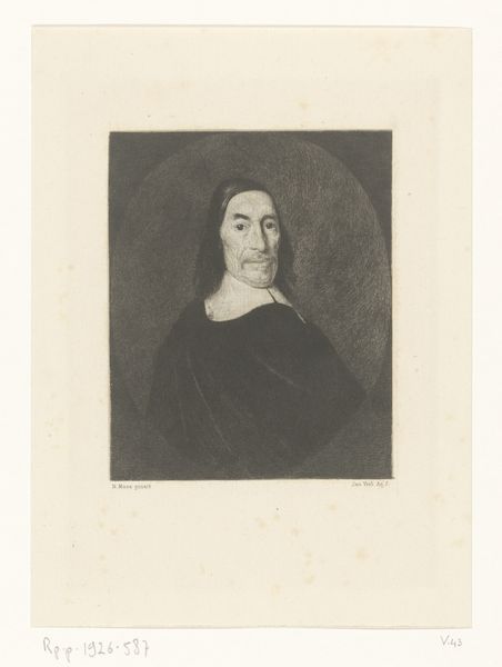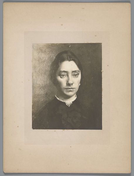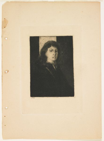 Curator: What strikes you first about this etching, "Portrait of Adèle Meunier-Danse, wife of the artist," created in 1896 by Auguste Danse? Editor: There's a delicate melancholy about it. The limited palette and the soft focus lend an air of wistful introspection. It feels quite intimate, wouldn’t you agree? Curator: Absolutely. It reflects the intimate circle within which art often flourished. Danse was depicting his wife, thereby reinforcing the established patriarchal art system and simultaneously honoring the place of the domestic as inspiration. Etchings at this time became an accessible, less formal form of portraiture. Editor: And it's filled with symbols that represent love, devotion and even the artist’s desire to eternally imprint his spouse in paper. The gentle curve of her brow, the soft, almost ethereal lighting around her face... These visual cues trigger very specific feelings. Her demure appearance also indicates an era where beauty and feminity were still represented within certain socially prescribed constructs. Curator: The context is key, really. Think of late 19th-century social structures and how printmaking was becoming democratized. Publications, magazines – images circulated differently, reaching broader audiences. Prints like these challenged traditional notions of artistic value. The relative affordability and reproducibility made art more accessible, less elitist. Editor: Though still rooted in convention. It’s a portrait, after all, but a portrait softened by Impressionistic techniques. A kind of domestic Impressionism. The way light interacts with her face it suggests that idealized form. Yet her gaze has an intensity, reflecting an inwardness, breaking some of the typical conventions. Curator: It encapsulates the period's tensions: established norms versus burgeoning artistic experimentation and evolving access to culture. These visual dialogues reflect the wider societal conversations that are always at play. Editor: Indeed, from the artist’s emotional tie to its cultural implications. I see this image a dialogue between intimate feeling and social convention. Curator: Precisely. This etching, a glimpse into a marriage, but also into a period of artistic and social flux.