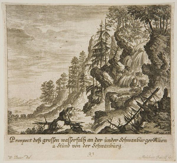 Editor: Here we have Melchior Küsel's "A View in Steirmarck, Drawn in the Vicinity of Heizberg," an engraving on a small plate. It strikes me as both romantic and a bit ominous. What catches your eye in this landscape? Curator: The theatricality of it all! It’s a stage, isn't it? The meticulously placed trees, the tumbling waterfall, that precarious fallen tree. It's almost as if nature is putting on a play for us. Do you think that drama is a part of its charm? Editor: Absolutely, I didn’t realize that before. It makes the small figures feel even more exposed to the wildness. Thanks for pointing that out. Curator: And thank you for seeing the initial darkness. Maybe Küsel was hinting at something more, beyond the picturesque view.