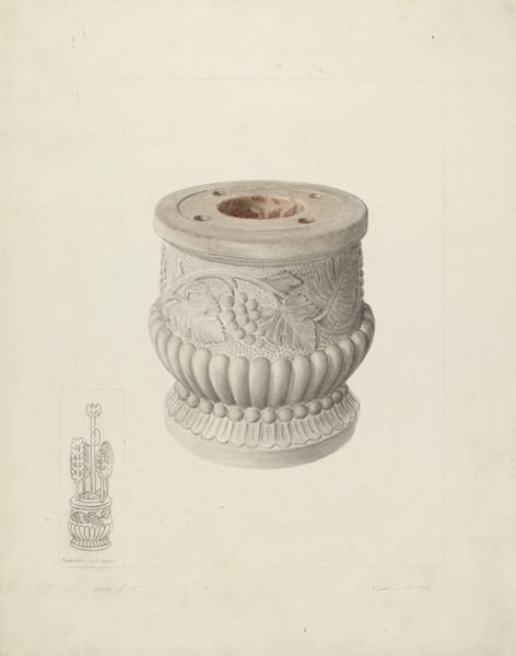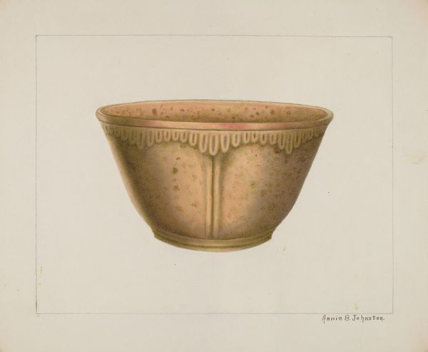 Curator: Rose Campbell-Gerke's "Carved Stone Was Basin," created around 1939, presents us with a beautifully rendered watercolor and pencil drawing. Editor: It exudes a certain stillness. The neutral tones, the straightforward composition…it feels almost archaeological, a quiet study of a utilitarian object raised to the level of art. Curator: Precisely. Campbell-Gerke, working within the context of the 1930s, engaged with a prevalent trend to document American material culture. There was a conscious effort to preserve and valorize objects linked to earlier periods in America. The rendering possesses the quiet reverence typical of WPA-era artistic endeavors. Editor: So, it's not just about the stone basin itself, but what that object represents—access to cleanliness perhaps, civic order, even survival, during times of drought and hardship, when hygiene became particularly crucial, especially for women. Curator: Absolutely. Think about the historical context; hygiene disparities disproportionately affect marginalized communities, especially women, and this access becomes intrinsically political. Campbell-Gerke's choice is not accidental, it implicitly raises questions about social justice. Editor: But on the surface, the presentation is so…serene. Almost deceptively simple. We don't immediately register these layers of social commentary, because, as an artwork, it seemingly presents the object without obvious political fanfare. It's as if the quiet dignity of the object, is itself, a commentary on power, the act of recording such common items. Curator: Indeed, Campbell-Gerke is, in a way, offering us an implicit social commentary. Her careful attention elevates what many would have considered ordinary, emphasizing the significance of accessible sanitation and water as crucial social indicators and as political rights. Editor: Well, looking at it through that lens definitely adds a lot of resonance. What seemed at first glance a straightforward drawing opens up to reflect deeper cultural currents of its time. Curator: It reveals how even seemingly benign objects can reflect social conditions. Editor: It causes you to rethink the political value of the object that becomes part of the imagery, the social agency, and that kind of legacy on history.