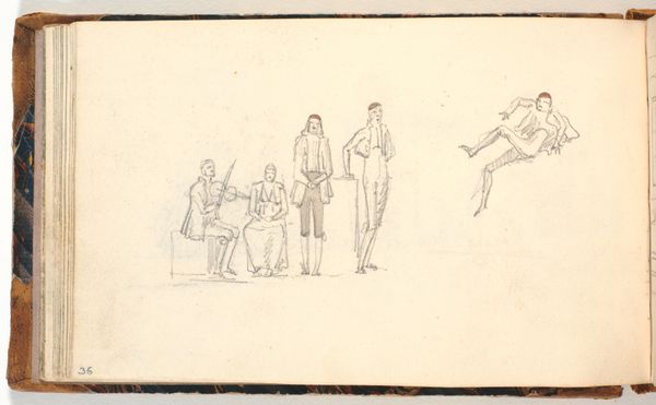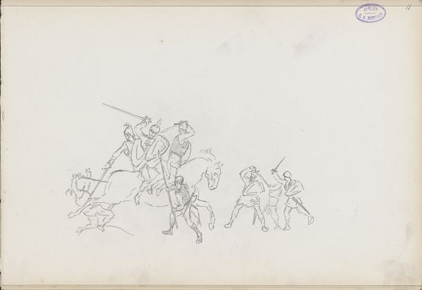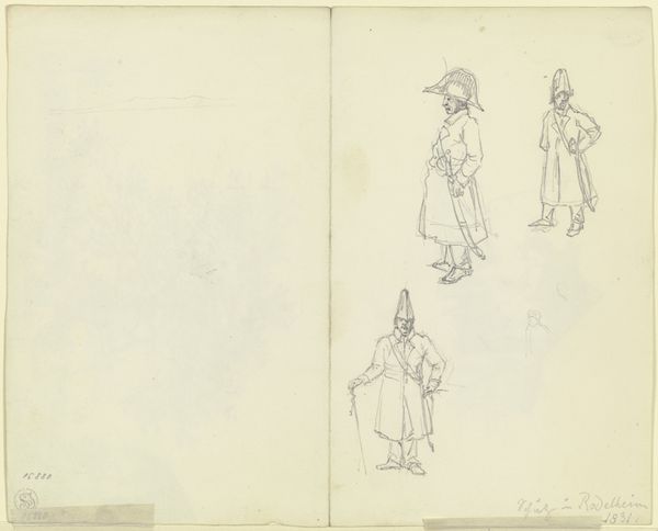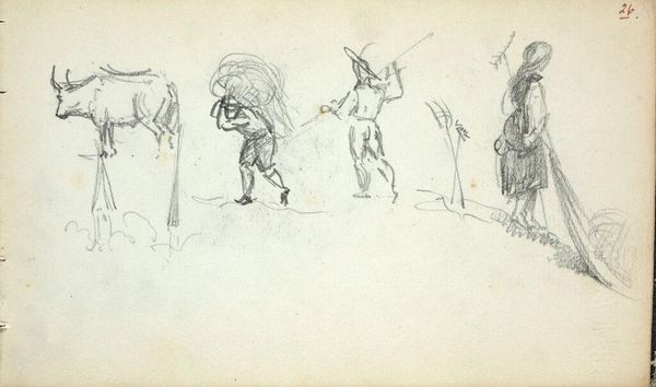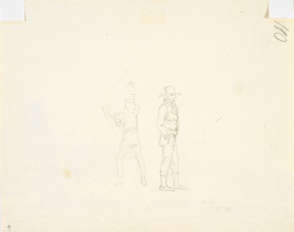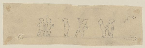Editor: Here we have J.C. Dahl's "Three Men Carrying Large Burdens on Their Necks and Heads," a pencil drawing on paper from the 1820s. It feels…stark. There's this empty space around these figures, and their stooped postures really emphasize the weight they carry. What visual elements stand out to you? Curator: Indeed, the artist's deft use of line and form is paramount here. Observe the rhythmic repetition of the figures; each echoes the others, creating a sense of continuous labor. The very sketchiness of the line lends a raw, almost brutal quality to the scene. Consider the blankness of the background: rather than a detailed environment, it is the weight of the implied burden that commands our attention. What compositional strategies do you notice? Editor: Well, the men are almost silhouetted, and the lack of detail on their faces makes them seem universal. The burden is almost abstract – bundles of sticks or cloth or something unknown, it doesn't really matter, does it? The drawing emphasizes the abstract idea of labor more than the specifics. Curator: Precisely. It's the formal arrangement, the relationships between line, space, and form that create the power of the work. Forget the external context; how do the individual marks build toward the totality of the image? Editor: So, the drawing's power comes from the visual language itself, rather than what it represents? Curator: Exactly. It's the semiotic construction of meaning through purely visual means. By reducing the scene to its essential forms, Dahl invites us to contemplate the formal properties. The texture of the lines implying both weight and the figures’ struggle... Editor: This makes me appreciate how form itself is meaning! The artist controls what is presented but our brains immediately process so much extra information that wasn't drawn, a kind of co-creation! Curator: Precisely. Form informs content.