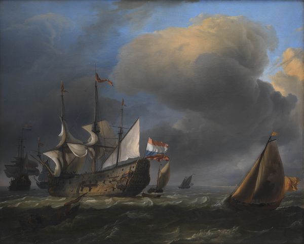 Editor: Hendrik Kobell’s *The Shipwreck*, painted in 1775, really captures a terrifying scene. The dark clouds and the way the waves crash against the ships create such a sense of drama. What are some of the historical factors that may have influenced Kobell in the making of this painting? Curator: This work really exemplifies the late 18th-century fascination with the sublime. Think about the social context: this was an era of burgeoning exploration and maritime trade. But with that came inherent risks and uncertainties. The shipwreck became a powerful symbol, not just of physical disaster, but of the fragility of human ambition against the overwhelming force of nature. Editor: So, it’s more than just a depiction of a shipwreck? Curator: Absolutely. Consider where paintings like this would have been displayed. They were often commissioned by wealthy merchants or displayed in public spaces, acting as both a cautionary tale and a testament to human resilience. It’s interesting to analyze how these images reinforced certain power structures, too. Who are the people on the shore? Are they passive observers or active rescuers? These details tell us a lot about social hierarchies and attitudes towards disaster relief at the time. And beyond that, what did “disaster” mean? Who cared? And why? Editor: I hadn’t thought about it in terms of power structures before. Now, seeing those figures on the shore makes me question their role differently. It really puts the piece into a different light. Curator: Precisely! By examining the painting's historical and social context, we can better understand its significance beyond just the dramatic scene it depicts. We move past aesthetics into considering power, disaster and what this image may have done in public imagination at the time. Editor: Thanks for helping me think through that. I see now how much richer the painting becomes when considering the societal context. Curator: It’s rewarding to consider all those components to better understand the artwork, from initial display to public consumption.