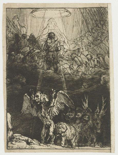 Curator: Standing before us is a drawing attributed to George Bickham II, dating roughly from 1760 to 1765. It’s titled "Christ Crucified between the two Thieves: 'The Three Crosses'", and you can find it here at the Rijksmuseum. Editor: Whoa, heavy. It feels almost swallowed by darkness, like a memory struggling to surface. All those stark lines, those anguished faces. It’s intense. Curator: Bickham, operating in the mid-18th century, was working within a well-established visual culture regarding depictions of crucifixion. Think about the theatre of it all, the public spectacle designed to enforce religious and political authority. Editor: Yes! It's all swirling around the figures on the crosses. Are they spectators, or perpetrators, or just souls caught in the fallout? There is very fine shading with some areas where no light penetrates the dark hatching lines. Curator: That’s the real power here. Rather than focusing on a serene, idealized Christ, Bickham plunges us into the chaos and emotional turmoil surrounding the event. This piece reveals more of an introspective approach of grief and loss and raises big questions of guilt. Editor: Absolutely. It's like we're not meant to passively observe; we're implicated. The rough charcoal or pencil—maybe even some oil pastel work as well— it's all a bit smudged which amplifies that sense of unease and discomfort. Is there something cathartic in its honesty though, a raw attempt to comprehend incomprehensible suffering? Curator: That gets me thinking about how such imagery functions within society. How the constant exposure to scenes of suffering shaped people's sensibilities and ideas about power. There's this interesting tension, this drawing, between devotional object and indictment of social order. Editor: True, and I see the value in keeping art that makes you uncomfortable, that unsettles expectations. This picture might be able to prompt dialogues which could make us more human… or perhaps show us just how capable humanity is in causing destruction to others and how we’re affected when we have to deal with such horrific events. Curator: Precisely. It offers, if nothing else, a glimpse into the artistic representation of humanity, faith, and moral struggle. Editor: I’m walking away from it pondering the artist's choice to capture this moment and considering all those countless perspectives existing in a world in any era that we’ll never know.