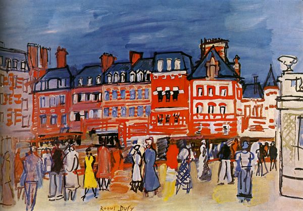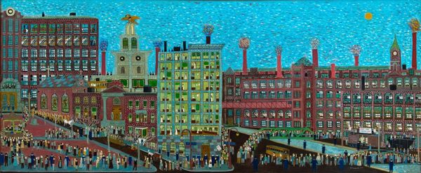 Curator: Welcome. We’re standing before Hiro Yamagata’s "Gare St. Lazare," created in 1986. It's an acrylic painting offering a contemporary take on the iconic Parisian train station. Editor: My first impression is one of whimsical delight. The color palette is striking, those blues feel so cheerful, and it’s teeming with these little figures…it's like a fantastical cityscape. Curator: Notice how Yamagata employs almost a neo-impressionistic technique with the application of paint. The composition is dense with detail, offering a fascinating study of geometry within an urban environment. The repeating shapes of windows and buildings create a strong structural rhythm. Editor: And yet, that very geometry is juxtaposed with what appears to be a chaotic swirl of human activity. It makes me wonder about Yamagata’s intention. This isn't just a scene, it feels like a comment on modern life – the frenetic pace, the layers of advertising, a farewell parade. The banners are marked “Bye Bye” implying movement. Curator: That interplay is key. Consider the formal contrast between the rigidity of the architectural structures and the fluid movements of the people. This dynamic could be interpreted as a visual representation of the push and pull between order and chaos. Semiotically, the repeated imagery functions almost like a visual echo. Editor: Yes, and I see in it a tension between progress and nostalgia. A sign blares out: "Danse! The Art…Gap!" Are the crowds here being asked to participate or spectate in something bigger, a changing world that reflects social fractures and an overwhelming, potentially unnavigable city? Curator: A compelling consideration. It certainly pushes the boundaries of a typical cityscape, creating space for deeper interpretation. The eye is allowed to jump around within the formal qualities, even lingering on one spot only momentarily. Editor: Ultimately, this Gare St. Lazare exists as more than simply an architectural depiction. It is a symbol imbued with layers of human meaning and cultural context. It becomes a site of coming and going. Curator: A richly textured visual experience, indeed, offering continued engagement with form and symbolism. Editor: Leaving us to consider our relationship to the past, the present, and perhaps, to urban spaces and societal structures as a whole.
