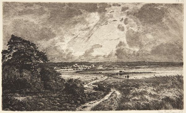 Curator: “Summer Morning,” a charcoal drawing rendered into a print by David Lucas in 1831. It just oozes rural tranquility. What’s your immediate sense of it? Editor: Grayness. And not just because it’s a print; there's something subdued, almost melancholy, about the light and the scene itself. A sense of heavy, humid air…almost oppressive, really. Curator: Oppressive? I see a quiet beauty, light filtering through clouds, touching the cows, the land… Doesn't it evoke that particular, gentle start to a summer's day? The birds lifting, the world awakening? Editor: I notice the density of the blacks, the obvious manipulation. Charcoal’s sooty reality, translated through laborious processes, transforms rural life into commodity for urban consumption. Even those "romantic" rays feel… manufactured. Curator: But the Romantic movement was all about feeling, wasn't it? That sense of the sublime within the ordinary? Surely that’s what Lucas, channeling John Constable, his teacher, aimed for, crafting this drawing that evokes a mood, a specific fleeting moment in time? Editor: Crafted is key. Think of the man hours involved to create this piece, from charcoal production to preparing the printing plates. A very material transaction for representing… well, laborers themselves. Is that child in the foreground working? Curator: Perhaps tending the cattle, simple pastoral work... a small moment of the great working day that has started. And this drawing… I find something really beautiful in the layering and gradations. Lucas, from the hands, coaxed a wonderful range of tones, giving a lovely luminous effect to that skyscape. Editor: I see the appeal, definitely. But acknowledging the unseen labour that went into capturing "Summer Morning", really underlines the social and economic framework within which this 'pastoral scene' came to be, where some do the dreaming and others the sweating to bring it into existence, a material cycle. Curator: Yes, a drawing, even of something so simple as dawn over land, doesn’t emerge from a vacuum. The social context certainly shapes the output, it always does… But still, maybe there’s still space left for simply savoring the poetry it creates! Editor: Precisely, "creates"! Recognizing art as something built, layered, worked over gives me something solid, a new appreciation, far from "divine" inspiration... And from my understanding, that can only deepen anyone else's engagement with the work here too.
