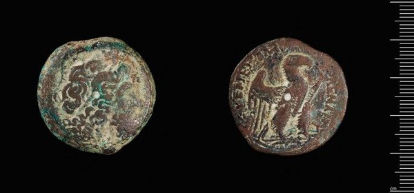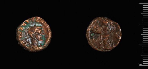 Editor: This is a tetradrachm, a coin from Alexandria under Diocletian. It’s small, but the wear and the verdigris give it so much character. What can you tell me about it? Curator: This coin speaks to power dynamics within the Roman Empire. The portrait of Diocletian presents a clear image of imperial authority, while its production in Alexandria highlights the city's economic and cultural importance. It's a potent symbol of Roman hegemony, isn't it? Editor: Definitely, seeing it now, it gives me a lot to think about. Curator: Consider how this imagery, replicated across currency, reinforces social hierarchies and Roman dominance. What does it tell us about identity, power, and resistance within the empire? Editor: It shows the extent to which the ruler controls the image circulated of himself, and the culture. Thanks for shedding some light on the complexities of this little artifact! Curator: My pleasure. This coin offers a fascinating lens through which to examine broader historical and societal power struggles.