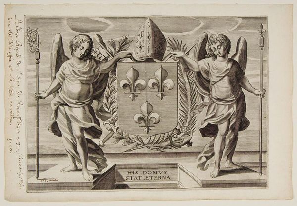 Bernard Picart created this engraving titled 'Engel kroont twee putti omgeven door ornamenten', or 'Angel crowning two putti surrounded by ornaments', around 1715. Here, a winged angel crowns two cherubic putti with wreaths, all framed by ornate foliage. The putto, derived from classical antiquity, represents innocence and divine love, often seen in Renaissance and Baroque art. The wreaths, symbols of victory and honor since ancient Greece, highlight a tradition of celebrating achievement that has been passed down through history. These motifs echo through time, appearing in various forms and contexts. The gesture of crowning, for instance, transcends mere decoration; it embodies the bestowal of power and recognition, a concept deeply rooted in our collective consciousness. The image serves as a potent reminder of how symbols and gestures persist, continually reinvented, engaging our emotions and minds across generations.