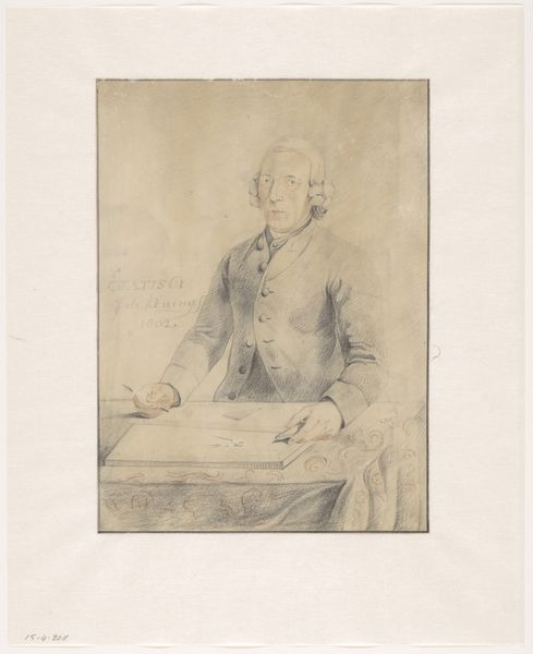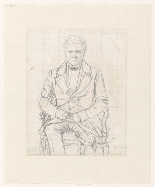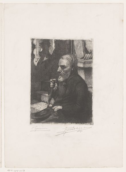 Editor: This is Emilius Wilhelmus Dehé’s "Portrait of the Artist’s Father with Violin," made between 1896 and 1947, using pencil and print. The textures created through the printing process give it such a unique look, and it feels very intimate, like a candid glimpse into a personal moment. What do you see in this piece? Curator: The violin speaks to me first. Think of its shape, held close to the body, resonating with the heartbeat. Consider what that implies for the father. What emotional or cultural narratives are being conveyed by him cradling this instrument, this extension of himself? It almost becomes a biographical note about his person. Editor: That's a lovely thought. I was mainly just looking at his expression. Curator: And what does it convey to you? Is it a moment of rest, reflection? Perhaps, think about it from a Freudian perspective. The father image holding tight onto his extension, this object with such prominent curves. There's something being represented of legacy and identity through these forms and materials. Don't you see a connection here, that tells you more about the values the artist holds dear? Editor: I never thought of it that way, that is a compelling interpretation! It makes me wonder how the father’s role as a musician shaped the artist’s world. Curator: Precisely! We’ve touched upon the instrument's emotional weight, but also the artistic inheritance, the passing down of skill and passion. These kinds of visual connections reveal so much about family dynamics, don't you agree? Editor: Yes, I see how focusing on symbols helps unravel layers of meaning. Curator: Always consider how objects transcend their physical presence. By observing such visual keys, the symbolic language being communicated offers glimpses into the artists innermost emotions.