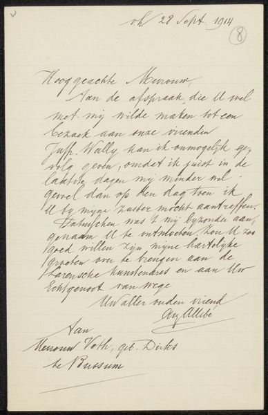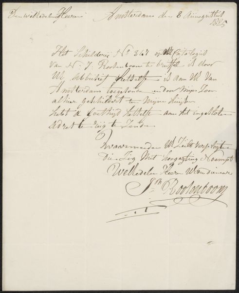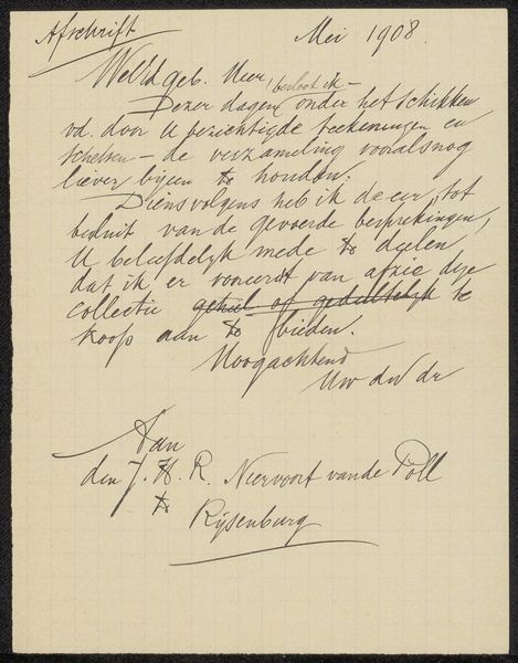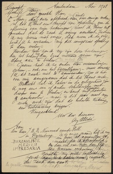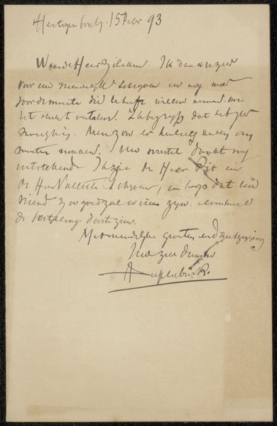 Editor: Here we have "Brief aan Hendricus Petrus Bremmer" by August Allebé, likely created between 1914 and 1919. It’s a drawing done with pen and ink on paper. It strikes me as an incredibly intimate piece, almost like peering into someone's personal thoughts. The handwritten nature adds to that feeling. What do you see in this work? Curator: I am particularly drawn to the linearity of the work. Consider the sinuous, almost unbroken lines that form the calligraphic script. Allebé masterfully uses this to create a sense of visual rhythm. Notice how the varying thickness and pressure of the ink create contrast and depth, giving each letter its own unique presence within the overall composition. Editor: So you're focusing on the form of the letters themselves rather than what they say? Curator: Precisely. While the content surely holds meaning, as a formalist, my primary focus is on how the elements interact. Consider the white space of the paper; it’s not merely a background, but an active participant, shaping the forms and directing the eye. How do you see the relationship between positive and negative space within this work? Editor: I guess I hadn't thought about the negative space so much. Now I see how it gives each word room to breathe and highlights the differences in each section of the drawing. Curator: Indeed. And that very breath contributes to the dynamism and inherent structure, wouldn't you agree? The artwork is both a message and a beautiful abstract organization. Editor: This approach really opens up my eyes to appreciating the artistic intention through visual analysis, especially something as seemingly straightforward as a letter. Thank you for the new insight. Curator: The pleasure was all mine. Close observation always offers its rewards.