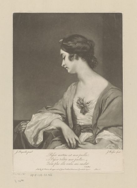 James Watson created this print, “Portret van Christiana Collier,” using mezzotint, a process that allows for rich tonal contrasts. The print offers us a glimpse into the visual culture of the late 18th century. During this era, portraiture was not merely about representation; it was deeply intertwined with social status and identity. Christiana Collier's demure posture and the delicate rendering of her features speak to the era’s ideals of femininity: modesty, grace, and beauty were highly valued. Yet, the print also subtly challenges these norms. While it presents Collier within the bounds of societal expectations, there is a hint of individuality in her gaze. This was a period of significant social change, as the Enlightenment ideals began to question traditional hierarchies. How does this portrait reflect or resist these shifting cultural values? It invites us to reflect on the complex negotiations individuals, especially women, navigated in constructing their identities.