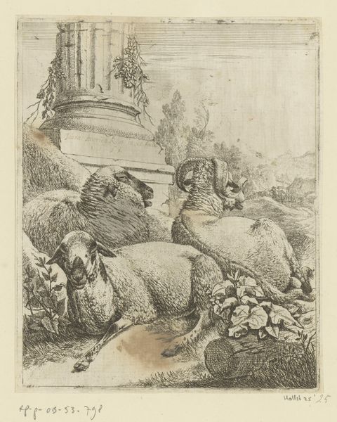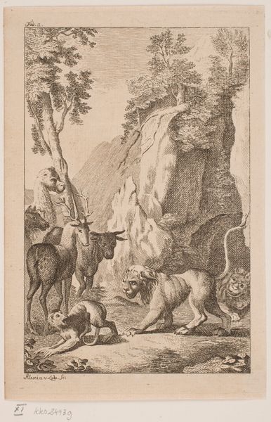 Curator: It has this kind of hushed, storybook quality about it, doesn't it? So delicate. Editor: This is "Ørnen og en Forsamling af Fugle," dating back to 1760, housed right here at the SMK. It's a striking print by Alexia von Lode. The interplay of etching and engraving gives the lines such a crisp feel. Curator: It's that crispness that draws you in, almost against your will. It feels allegorical, you know? Like something from Aesop. Is that little structure in the background a dovecote? Editor: Potentially. The work certainly invokes folklore; von Lode had likely observed and participated in craft production influenced by a vibrant folk tradition, now mediated through a luxury market that appreciated small prints and drawings. The production techniques point to skilled labor being deployed in what's made for entertainment. Curator: I can't help but feel a sense of unease when I look at the central eagle. It's placed so deliberately amongst those other smaller birds. I mean, is it protecting them, or plotting something much more sinister? I feel like I'm supposed to find some deeper wisdom here, perhaps on the relationship between power and vulnerability. Editor: You’re spot-on to sense the tension! That central eagle and how von Lode renders its dominance likely has much to do with courtly spectacle and prevailing aristocratic culture from the period, not merely some naive fascination with the animal world. Look closely—those fine lines took training and skill, acquired presumably through patronage. Curator: It's all those hatched lines giving depth, volume, almost a tactile sense of texture. But you also lose clarity that creates some uncertainty in meaning, wouldn’t you say? And then it fades away at the edges with a wonderful sense of freedom. It makes me ponder the constraints under which creativity sometimes struggles... Editor: Indeed. In its own way, the work is subtly raising some questions of craft and labor. The work’s enduring presence invites reflections on class and its effect on representations of power, as much as anything else. Curator: Agreed, so wonderfully ambiguous, and deeply evocative about artistic intention in general, centuries after it was crafted! Editor: Absolutely. Thanks for joining me to consider it today.