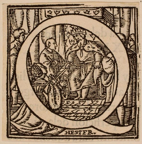 Editor: This is "Letter D", an anonymous print from the Harvard Art Museums. It's a striking image; the figures within the letter seem to be engaged in a debate, perhaps? What's your take on this work? Curator: I'm intrigued by the power dynamics at play here. The male figure, seemingly gesturing assertively towards the female figure nestled within the "D," invites questions of gender and authority. Is this a representation of dominance, or something more nuanced? Editor: That's an interesting point about power, how does the tree factor into it? Curator: The tree could symbolize knowledge, but who has access to it? The male figure seems to command the space outside the letter, while the female figure is enclosed within it. It reflects a historical narrative where knowledge and power were often unequally distributed. What do you think? Editor: That gives me a lot to consider, the framing of the letter itself adds another layer. Curator: Exactly! We need to interrogate the power structures inherent in visual representation.