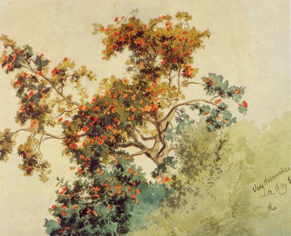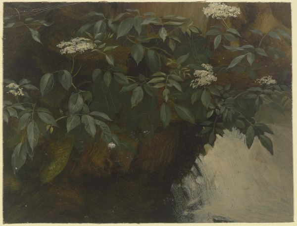 Curator: This is Fidelia Bridges's watercolor, "Trailing Arbutus," completed in 1863. What are your first thoughts? Editor: It feels incredibly intimate, almost like a secret world I've stumbled upon while crawling through the undergrowth. The light is so gentle, isn't it? Curator: Absolutely. Bridges’s masterful command of watercolor allows her to render delicate light variations with incredible precision. Observe how the blooms contrast against the darker foliage, creating depth. It's not merely representational; it’s a carefully constructed composition. Editor: Yes, and the scale! It’s like the whole world shrinks to the size of these little blossoms. They seem both fragile and incredibly resilient, pushing through what looks like quite a tangled mass. It evokes a kind of quiet perseverance. I also notice a lone red berry, a splash of dramatic color against all the subdued greens and pinks. Curator: Indeed. The isolated berry punctuates the otherwise muted palette and introduces visual complexity. Semiotically, it could be seen as a signifier of the promise inherent within nature. It’s this tension between minute detail and overarching design that establishes the structural integrity of the work. Editor: I'm seeing, really seeing, the tenacity of these blooms in this somewhat unrefined surrounding! What an optimistic way to make art, when it can feel like everything around you is so turbulent, at least it feels that way these days. Curator: Your point reminds me that even from a formal perspective, the naturalistic accuracy speaks volumes about Bridges’s artistic dedication, especially given her pioneering spirit. Her attentiveness transcends pure imitation, venturing toward almost scientific scrutiny of the world she inhabited. Editor: A world that feels more real because of it, and to which now I'm drawn and perhaps won't soon forget! Curator: Agreed. Bridges's ability to synthesize her careful observations and transform them into lasting images solidifies the strength and clarity of her vision.