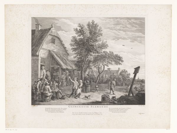 Curator: What strikes me immediately about this image is its composition. It has the feeling of a stage, doesn't it? The dancer is spotlighted in the center, framed by the audience to the left and musicians to the right. Editor: Indeed. What we're viewing is an engraving entitled "Ronggeng dans te Java", dating from after 1856, credited to Carel Christiaan Antony Last. It's currently held here at the Rijksmuseum. I find its portrayal of cultural performance deeply intriguing, specifically how it situates a very local art form within a potentially colonial gaze. Curator: The colonial gaze is definitely a lens through which we can read this. Look at the faces of the onlookers on the left – the distinctly European features standing in stark contrast to the local inhabitants. The artist seems concerned with the act of witnessing itself. Do they understand what's happening before them, or is it merely exotic spectacle? Editor: The positioning of the musicians, with their traditional instruments, feels deliberately ethnographic. The artist positions them almost like specimens, cataloging aspects of Javanese culture. I am interested in what this reveals about power dynamics between observer and observed at the time. What kind of role is the Western gaze having on this image? Curator: Precisely! We must consider the significance of the ronggeng tradition itself. Ronggeng is more than just dance; it embodies sensuality, social connection, and ritual. It represents an intersection of entertainment and spiritual practice. Perhaps these foreigners were interpreting a tradition filtered by their own assumptions. Editor: It makes me wonder about the function of art at that moment in history and about Last's possible role in shaping a Dutch idea of "the Other." "Ronggeng dans te Java" can certainly lead us to broader conversations about representation, exoticism, and the cultural politics embedded in 19th-century visual imagery. Curator: Absolutely, there is much to think about in regards to cultural representation and performance. We cannot know the whole story, but we can, and should, analyze the historical context and explore the rich interplay of meanings imbedded in cultural imagery. Editor: A potent image with layers of narrative to unfold, its artistic presentation is only part of a story still unfolding to this day.