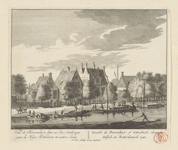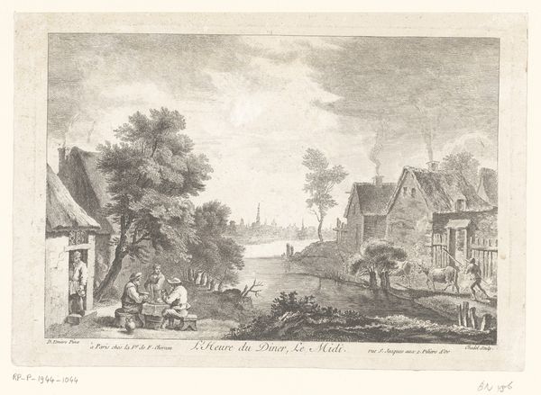 This is Paulus van Liender’s etching of Gezicht op het dorp Nieuwland in de gemeente Vijfheerenlanden. The eye is immediately drawn to the symmetry of the composition. A bridge acts as a central horizontal axis, dividing the scene between reflection and reality. Van Liender’s use of line and shading creates a detailed, almost photographic representation. The textures, from the thatched roofs to the foliage, are rendered with precise strokes. This attention to detail invites the viewer to explore the intricacies of the village scene. The semiotic function becomes clear: each element, from the church spire to the figures on the bridge, signifies a facet of community life. The artist uses scale to emphasize the importance of the church. Its spire dominates the skyline. The overall effect destabilizes the traditional hierarchy between nature and civilization. The village is nestled seamlessly into its natural surroundings. This harmony, captured through the formal balance of the etching, offers a serene, idealized view of 18th-century Dutch life.