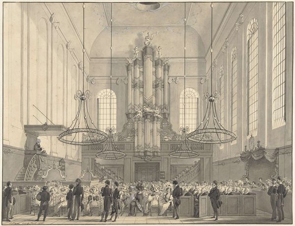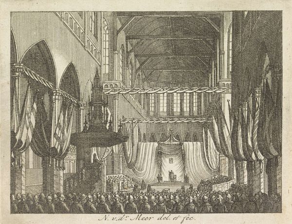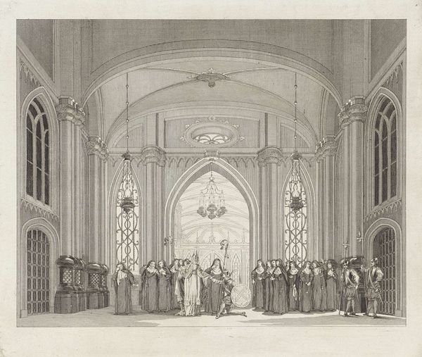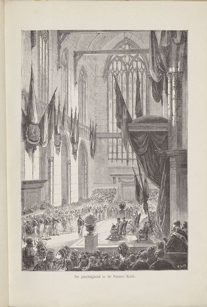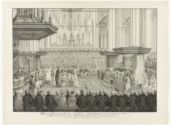 Curator: This print, "Inhuldiging van Willem Frederik, prins van Oranje als souverein vorst, 1814," depicts the inauguration of William Frederick as sovereign prince. It’s an engraving made in 1814 by Noach van der (II) Meer and held at the Rijksmuseum. Editor: Immediately, the spatial structure impresses—a cathedral rendered with astonishing precision. Note the contrast between the soaring Gothic arches and the human drama unfolding at ground level. A visual treaty, no? Curator: Indeed. Beyond its architectural portrayal, the work employs several well established symbols for leadership. Notice the elevated dais and draped flags; symbols of power and nascent nationhood. Editor: Yes, flags often symbolize unity but, more acutely, division from some “other.” Considering the artwork's time and setting, might this new unity be a fresh signal following Napoleonic dominion? A new chapter? Curator: Quite possibly. There is something rather academic and calculated about this print’s realism. Everything seems so orderly, controlled… yet that could be a commentary on the hopes for a stable, new government after years of upheaval. It reflects the neo-Classical ideals prevalent then. Editor: The way light is captured also creates depth and a distinct atmosphere. We see illumination filtering through what look to be tracery windows… evoking a solemn aura suitable for sacred political rite. Are these calculated tonal gradations integral in the storytelling? Curator: Indubitably. Light functions here less as a physical property and more as a means of accentuation and visual command. But I can’t shake the feeling that its realism hides an emotional layer related to what had just been a total transformation of the entire continent of Europe. Editor: Which returns us to those drapes... like theatrical curtains lifting upon this stage, setting the stage for the spectacle and rituals inherent to creating a national myth. I found this view on Dutch royalty to be quite informative. Curator: Agreed. Analyzing this print through a lens of visual construction has been revelatory for me. The piece yields an unusual intersection between technique and time. Editor: As for myself, I have grown to understand the image as a memory stone of hope, reborn from tumult.