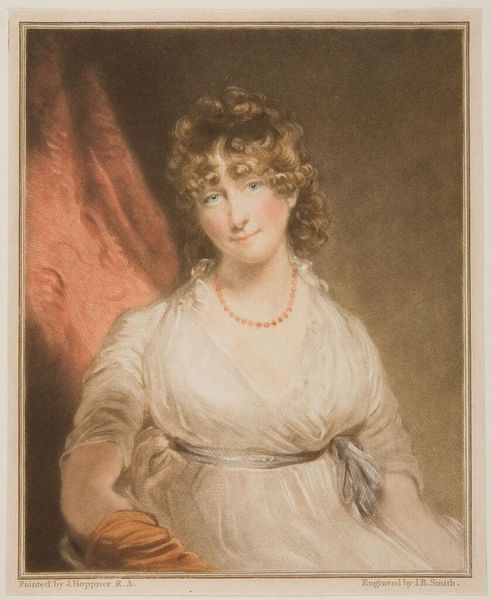 Editor: Here we have "Portrait of Miss Fisher," an oil painting by John Hoppner. The subject's gaze is averted, and there’s a distinct air of melancholy about her, even with that lovely red necklace. What stands out to you in this piece? Curator: What immediately captures my attention is how this portrait engages with the socio-political construction of femininity during the Romantic era. Her demure posture and soft, almost ethereal, white dress, seem to symbolize a particular ideal of womanhood, right? What happens if we begin to see it as performance of the feminine identity as it intersects with class and societal expectations? Editor: So, you’re suggesting that her outward presentation is communicating more than just personal style? Curator: Precisely. Consider the artist himself. Hoppner was a court painter, deeply entrenched in representing the aristocratic elite. The historical backdrop against which this was made: revolutionary fervor in France, anxieties about social upheaval... Wouldn’t that context affect the work? Editor: Absolutely, I hadn't considered how Hoppner's position would influence his representation of women, making it more than just a likeness. Is there anything else in the composition itself that tells a story? Curator: Think about the landscape. It isn't merely background; it is active, gestural. It adds a subtle drama that both reflects and amplifies her own sense of, dare I say, enforced gentility. She is part of this landscape. It invites us to think about individual experiences within greater systemic structures. What about you: any thoughts regarding how it invites the viewer? Editor: It's fascinating to consider how the portrait uses Miss Fisher to tell a story that's relevant far beyond her individual identity. Thank you for shining a light on these underlying narratives. Curator: My pleasure. This has highlighted, even more for me, the fascinating tension between personal portrayal and broader societal expectations at play in portraiture.