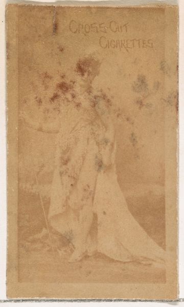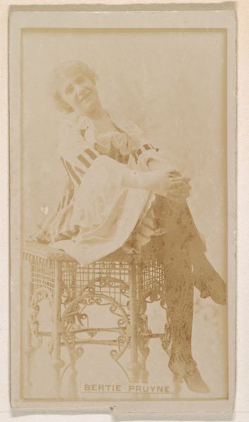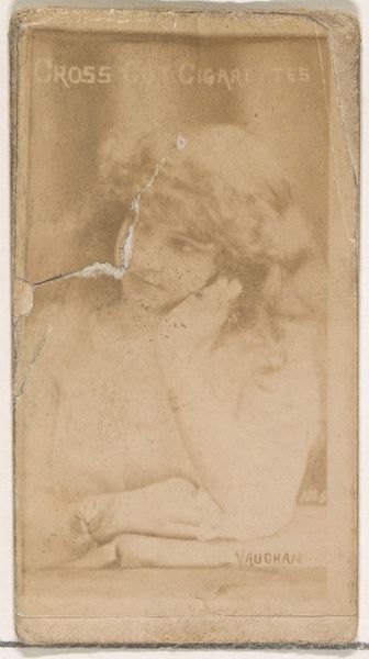 This is a vintage cigarette card featuring actress Georgie Drew Barrymore, part of a series by Allen & Ginter. The sepia tone flattens the image, emphasizing the soft, diffused light that gently models her form. Consider the composition: Barrymore is captured in a serene pose, leaning against an ornate balustrade. This structure creates a visual grid, segmenting the space and framing the actress within a controlled environment. Note how the backdrop, a blurred garden scene, contrasts with the sharp detail of the balustrade and Barrymore's figure, drawing attention to the constructed nature of the image. The light and shadow interplay, combined with the card's small scale, invites a close, intimate viewing experience. These cards, mass-produced and circulated, served as cultural currency. They flattened individual identity into a commodity. This miniaturization and distribution of fame reflect early forms of celebrity culture, challenging notions of uniqueness and authenticity. The card functions as a sign, encoding both the actress's public persona and the desires projected onto her.