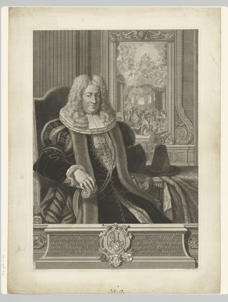 Curator: At first glance, the sheer accumulation of visual cues is overwhelming. It projects such status! Editor: Indeed. Let’s delve into this elaborate engraving, “Portret van Christoph Friedrich Imhof,” dating from 1750 to 1765, and created by Valentin Daniel Preissler. It certainly presents us with an intriguing case study in the construction of power and influence. Curator: The fur-lined robe, that almost architectural lace collar…he's literally framed in luxury and authority. What strikes me is the tension between the solid, almost earthbound figure, and the allegorical figures floating ethereally behind him. What does it all mean? Editor: Well, we can decipher some of it. Imhof was a senator from Nuremberg, as inscribed at the bottom, along with details of his birth and death. Preissler shrewdly uses visual rhetoric, combining classical allegory with the very real power this man wielded. Look, for example, at the figure of Justitia behind him, and the muse beside him…symbols of justice and art respectively. These allude to Imhof's cultivated persona and role within civic life. The maritime background suggests trade, Nuremberg's wealth and power rooted in it at that time. Curator: The scale seems significant, too. Despite being an engraving, there is monumental gravitas in the figure and the surrounding ornamentation. The composition gives weight to the symbols. Are they an affirmation of established order or maybe… a bid for immortality through art? Editor: Probably a bit of both! Public imagery, especially portraits like this, were crucial for shaping perceptions and solidifying social hierarchies. These images naturalized power, presenting it as divinely sanctioned, almost inevitable. This was baroque artistry weaponized for social positioning. Curator: It's interesting to see how deeply embedded those visual languages were. Today, our signals of power are so very different, less…dense, shall we say? The engraving, then, acts as a historical marker and a psychological profile. It leaves you with plenty to unpack. Editor: Precisely! This piece invites reflection on the relationship between individual identity, social representation, and the enduring power of symbolic language within political life.