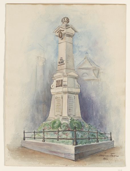 Editor: Here we have "Gedenkteken aan de Volksgeest van 1830 en 1831, onthuld 1856", a sculpture memorial created in 1856. It's very…stately, imposing. It's an engraving, a reproduction of something larger, no doubt. It definitely feels neoclassical in its rigid structure and form. What's your take on it? Curator: This image is fascinating because it speaks to how history is deliberately crafted and publicly presented. This monument commemorates the "People's Spirit" of 1830 and 1831—likely alluding to the Belgian Revolution—but it was unveiled much later, in 1856. How do you think the delay in its construction shapes its meaning? Editor: Hmm, it almost seems like a way for the Dutch to re-imagine that period or make a statement after things had settled. To solidify their national identity, perhaps? Curator: Exactly. Monuments are never neutral; they reflect a particular political and social context. The Neoclassical style lends an air of timelessness and authority. Who do you think this monument was meant to serve? Editor: Perhaps to remind the public of their history, their shared values, but also…maybe to promote a specific view of that history, one that suited the ruling powers at the time? Curator: Precisely. Think about how this image would have been disseminated – engravings for a wide audience. It becomes a powerful tool for shaping collective memory and reinforcing certain narratives. It’s crucial to question whose spirit is really being memorialized, and who is excluded from this vision. Editor: So much more than just a nice sculpture. Thanks! It's got me thinking about what stories our monuments tell and, more importantly, *whose* stories they tell. Curator: My pleasure. Remembering that art often functions as political messaging disguised as cultural heritage allows us to look more deeply.