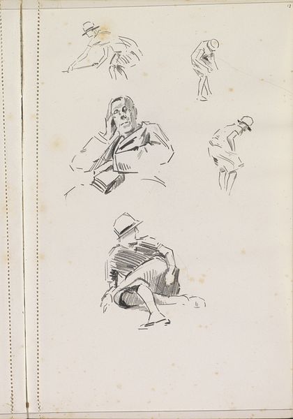 Editor: We are looking at "Figuurstudies," or "Figure Studies," a pencil drawing on paper from around 1880-1882 by George Hendrik Breitner, housed here at the Rijksmuseum. There is something almost ephemeral about the work; the sketches appear light and quick. What strikes you most about the composition? Curator: Indeed. Immediately noticeable is the artist's concentration on form and line. Note how Breitner uses only what is essential to convey the figure: a contour here, a suggestion of shadow there. Observe the economy of line, each stroke contributing to the overall structural integrity of the figures depicted. Where do you see tension or dynamism created solely through line work? Editor: The figure on the upper left—the darker shading gives a real sense of weight and presence despite being so simply rendered. What effect does the grouping of figures in different scales have? Curator: Scale, in this context, can be understood as a visual indicator of importance, but equally, it could point to different moments in time, a sequence of observations captured on a single page. Notice how the arrangement avoids a rigid, grid-like structure. It imitates a collection of notes, reflecting perhaps the artist’s thought processes. Editor: So the overall impact comes from seeing these diverse studies together rather than focusing on a single form. Curator: Precisely. It prompts us to consider the drawing not just as a depiction of figures, but as a meditation on the very act of seeing and representing. We see an exploration of form itself, independent of any specific narrative or context. Editor: I hadn't considered how much the *process* contributes to the feeling of the piece. Thanks for the clarification. Curator: It illustrates that by examining form, composition, and the materiality of art, new avenues for interpretations open.