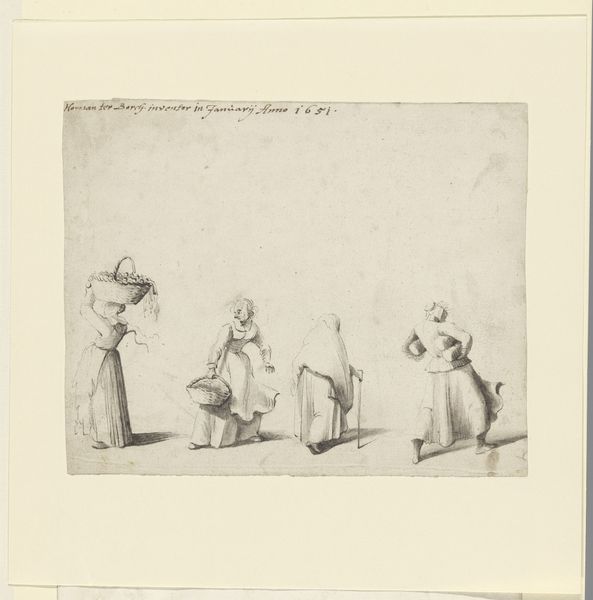 Nicolas Toussaint Charlet created this sketch sheet of diverse figures with pen and ink. The layout presents a collection of figures, each rendered with a focus on capturing gestures and expressions through the economical use of line. The composition is divided into segments, offering a glimpse into everyday life and character studies of different individuals. Charlet's approach reminds us of structuralist ideas, where art is a system of signs conveying cultural codes and meanings. The way he depicts figures, their clothing, and postures can be interpreted as signs that point towards certain social roles. We can interpret these sketches as a challenge to fixed social categories. The use of a semiotic system to interpret visual components allows the artwork to engage with new ways of thinking about representation. Ultimately, it’s the dynamic use of line in this sketch that makes it not just a collection of figures, but a vibrant commentary on the human condition. Art is a site of ongoing interpretation.