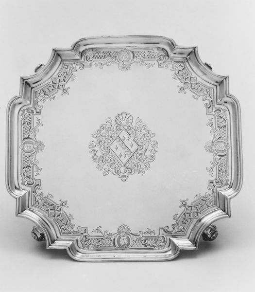 Curator: This Baroque silver dish, made by Jean-Baptiste I Buchet between 1726 and 1728, strikes me as a potent indicator of wealth and status in its time. It is on display at the Metropolitan Museum of Art in New York. Editor: Yes, it is a beautiful object, although maybe simpler than other decorative artworks of that time. What’s your perspective on the cultural or economic influences behind its creation? Curator: Considering it's a functional object elevated to an art form through precious material and craftsmanship, we can consider its place in the context of consumption during the period. The silver itself, where was it mined, who mined it? These questions lead us to consider colonial exploitation and trade networks central to creating such an object. And then, what foods were presented on it, what labour went into them? It challenges our usual definition of high art. Editor: That is so interesting, it puts a very different spin on what looks at first like simply a nice dish! Do you think the dish being Baroque has an impact in this? Curator: Absolutely. Baroque wasn't just about ornamentation; it was a theatrical display of power. This dish reflects how wealthy individuals used luxury items to assert their dominance. Even the production techniques themselves speak to a highly stratified labor system. The skill needed reflects specialist craft and labour conditions. Editor: So, we are not simply admiring the finished piece; we're also acknowledging the whole history of production, labor, and consumption embedded within it? Curator: Precisely. Looking at the object’s materials, we also engage with a crucial part of art history. Understanding what went into making it enriches our understanding. Editor: That's an approach I'll try to take when viewing other artwork, thinking more about the material context. Thank you!