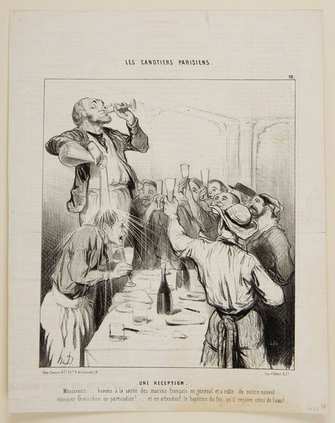 Curator: Look at this, a lithograph by Honoré Daumier titled "A Reception. 'Gentlemen… let's drink to the health of the French sailors in general and to the new teammate Greluchon in particular!… and while waiting for his baptism by fire, we'll give him in the meantime one with water,'" made in 1843. It’s part of the "Les Canotiers Parisiens" series. What strikes you first about this piece? Editor: The immediacy, the energy! The composition directs the eye upwards to the man drinking on the table, a real focal point made starker by the contrast of the shadowed background, doesn’t it? A feeling of drunken camaraderie, almost theatrical, but decidedly off-kilter. Curator: Precisely. Daumier often used his art as social commentary. These "Canotiers," or Parisian rowers, were a particular subject of interest. They represented a new, somewhat rebellious, leisure class, flouting social conventions after the July Revolution. Editor: The title suggests it's a celebration of this new 'teammate,' Greluchon. I love how Daumier uses line to convey movement – those radiating lines showing water being splashed create a fantastic sense of implied action and the sheer discomfort of poor Greluchon. Curator: That awkwardness, that very human quality, is a Daumier hallmark. But look closer at the political context. The 1840s in France were a period of social and political turmoil, rising industrialization, and growing discontent among the working class. These boisterous boaters are also a satirical jab at the bourgeoisie, caricaturing their excesses and trivial pursuits. Editor: I see what you mean. Even the textural variations, from the dark shading implying volume, to the sketchier details on their faces, highlight the nuances in his style. It’s this attention to both form and detail, balanced with his critical outlook, that captures and retains your attention. Curator: The lithographic printmaking allowed for the widespread dissemination of these images in periodicals, directly engaging with public discourse and forming opinion. Editor: It really underscores how powerful these artworks could be. From a formal standpoint, this use of dark and light adds depth, but from a socio-political angle, we see this as highlighting and emphasizing societal fractures. Curator: Ultimately, the artwork remains complex: is Daumier simply mocking or is he celebrating them in his own way, or maybe even critiquing a broader context? This blending and playing with perspectives makes his works so lasting, even today. Editor: Agreed. I walked away seeing a master of visual storytelling playing deftly with space, light, and perspective. Now, I see those design elements supporting a deeply insightful commentary.