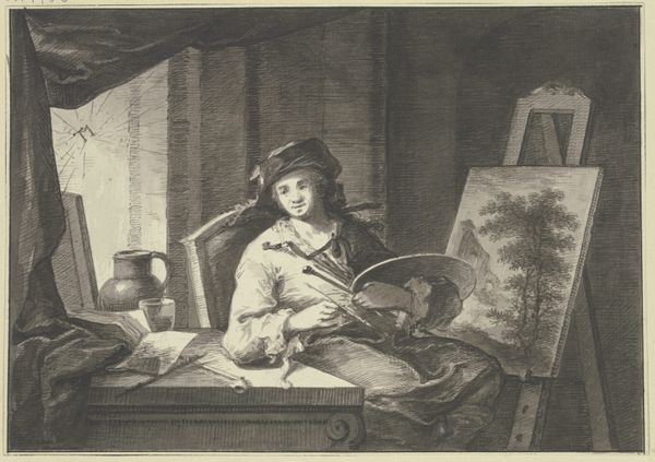 Editor: This pen drawing, "Skriveren Jens Melsen," from 1833 by Martinus Rørbye, currently at the SMK, has a sort of quiet domesticity to it. I’m immediately drawn to the cluttered desk and the man's focused expression. What stories do you think are embedded within this seemingly simple portrait? Curator: Rørbye gives us more than just a likeness, wouldn’t you say? Consider the symbolic weight of the open cabinet behind him. An open cabinet often symbolizes revealed truths, or a glimpse into one’s inner world. Perhaps the act of writing, and by extension Melsen’s profession, involves an unearthing of hidden narratives? What's the lingering echo of past lives and actions? Editor: That’s a fascinating way to look at it! I hadn't considered the open cabinet beyond its functional purpose. Do you think his rather distinctive clothing plays a role in that symbolic reading? Curator: Absolutely. Clothing, particularly in portraiture, communicates social standing and aspirations. Yet, Rørbye’s attention to detail – those decorative buttons, the carefully rendered cuffs – also adds an individual touch. It subtly conveys how the individual and their professional identity were intertwined in that era. Could his attire indicate an aspiration toward bourgeois respectability, perhaps? Or perhaps he truly wants to emphasize these particular values, maybe that tells something of his society. Editor: I see. So the symbols aren’t static, but resonate with cultural and personal significance. Curator: Precisely. The artist consciously or unconsciously captures something quintessential. How, through a relatively mundane scene, does cultural memory perpetuate and solidify? Editor: It’s amazing how much depth a simple drawing can hold once you start unpacking these symbols. I’ll never look at a portrait the same way! Curator: Indeed, images function as cultural Rosetta Stones. The art isn't necessarily about grandiosity, but the smaller intricacies that permeate over time.