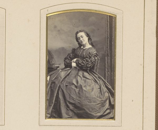 Curator: Let's take a look at "L'Interrogation," a gelatin silver print by Pierre-Louis Pierson, dating to the 1860s. It’s currently held at The Metropolitan Museum of Art. What’s your immediate reaction to it? Editor: There’s a real romanticism to it. She seems to be lost in thought or perhaps longing for something just out of reach. Her upward gaze is filled with longing, a hint of melancholy, and, well, the titular interrogation. The whole piece has an air of subdued drama about it. Curator: Absolutely, and contextually, Pierson occupied a peculiar position as the in-house photographer for Countess Castiglione. The Countess used photography as a means to craft and control her image, disseminating it through society, quite unprecedented for the time. Editor: Yes, and considering her status as a muse and her obsessive control over her image, one can't help but see the gaze as almost theatrical, meant for public consumption. The bare shoulder carries such visual weight; in older portraiture, it’s nearly always associated with an idealized Neoclassical style. What’s particularly interesting is the slight angling of the neck. There is an inherent vulnerability in her posture as well, perhaps even inviting intimacy. Curator: But it's important to understand the Countess's ambitions. These were not just vanity projects. They were deliberate exercises of power, shaping her narrative within the strictures of Second Empire society. Photography offered her a means to circumvent the male gaze as mediated through painting and the established Salon system. She curated her presentation to a T. Editor: That’s fair. It strikes me that we also have the power of costuming to consider. The voluminous dress overwhelms her frame. Is that a sign of modesty or opulence? Does the weight of her finery hold significance beyond simply marking wealth and social standing? Curator: Good questions! Think of it less as inherent modesty, and more about the calculated display of status and artistry. Fashion was a powerful tool for the Countess. The scale of her dresses became an emblem of her self-fashioned grandeur. Editor: The symbolism layered into dress is really significant here; she's controlling every aspect of how she is seen. I appreciate your emphasis on the artist using these elements to wield her own sense of power. Curator: Indeed. By delving into the historical context, we can move beyond seeing the photo as just another portrait, and grasp it as a critical piece of visual politics. Editor: Precisely, which enriches my view of it significantly. Now, I see much more intentionality, it deepens the symbolism in that slight turn of the neck and placement of her hands.
