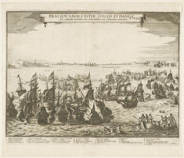 Pieter Hendricksz. Schut created this print, "Slag in de Sont, 1658" using engraving. Here we see a naval battle, the Battle of the Sound, between the Dutch and Swedish fleets. The Dutch Republic, a major maritime power in the 17th century, relied on trade routes through the Øresund Strait. Control over this waterway was vital for its economic interests. The battle itself reflects a period of intense geopolitical struggle in Northern Europe, with various powers vying for dominance in the Baltic Sea region. What is interesting is how the print translates current affairs into public imagery. Prints like this one were an important medium for disseminating news and shaping public opinion. They served as visual documents but also as propaganda tools, reinforcing national pride and justifying military actions. To understand the full scope of this image, we might consult contemporary newspapers, pamphlets, and diplomatic correspondence. The image gives us a glimpse into the intersection of art, politics, and public life in the Dutch Golden Age.