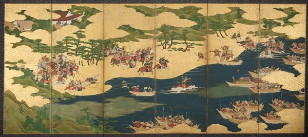 Editor: Ike no Taiga's "Landscape with Yueyang Tower," made around 1750 with ink and watercolor on paper, offers such a serene view. I'm immediately drawn to the contrast between the detail of the foreground and the faded background mountains. How do you interpret the historical and cultural significance of a landscape like this? Curator: Well, considering the cultural context, we see this isn't just a landscape, it is also a political statement. The Yueyang Tower, which dominates the right side of the composition, would have been a prominent feature, symbolic of imperial power and Confucian ideals of governance. The artist's choice to depict this specific locale serves a deeper purpose: to connect the work with intellectual and political discourse. It is also Yamato-e, reflecting a style favored in Japan during the Heian period (794-1185) where a focus on narratives and courtly life flourished. Editor: That's fascinating. So the landscape itself is a commentary? I mean, could this possibly express an opinion of how the Tower itself engaged with courtly life? Curator: Precisely. Look at the small figures included. They aren’t simply ‘in’ the landscape; their scale and activities within the painting, like the group traveling by boat, suggest an emphasis on ordinary people and their relationship with power structures. We must think about who had access to this image in the 18th century and consider the artist’s, or even the commissioner's, intent in its display. The placement within a specific setting becomes integral to deciphering its full meaning. Editor: I hadn't thought of the audience quite so much, or how its meaning is shaped by those early viewers. Curator: Art exists within networks, always. Understanding its original display context, audience, and how it circulated really helps to get closer to the full story. Editor: Thank you. I am learning there's so much more to a landscape than just scenery. Curator: Agreed. I am looking forward to understanding the layers with you.