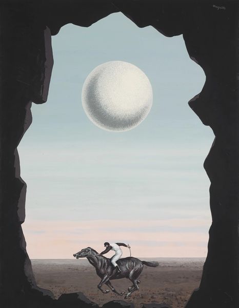 René Magritte presents us with “Le pain quotidien,” an oil painting that immediately captivates with its paradoxical imagery. The work layers dark rock formations that frame fluffy clouds upon which a nude woman stands pensively. The materiality of the painting—the smooth application of oil—enhances the dreamlike quality, drawing us into Magritte's uncanny world. The clouds, rendered with soft gradations of tone, create a sense of depth and ethereality. Yet, this illusion is disrupted by the stark contrast with the solid, almost surreal foreground. We can consider this composition as a semiotic system, where the woman—a signifier of vulnerability and purity—defies logic by her very placement, destabilizing our understanding of space and the human form. The tension between the tangible and the intangible, the earthly and the celestial, isn't just a visual trick. It challenges our fixed notions of reality. This dreamlike state, underlined by clean lines and the calculated structure of the painting, questions the structures that underpin our very understanding of the world.