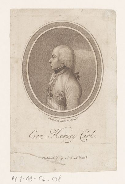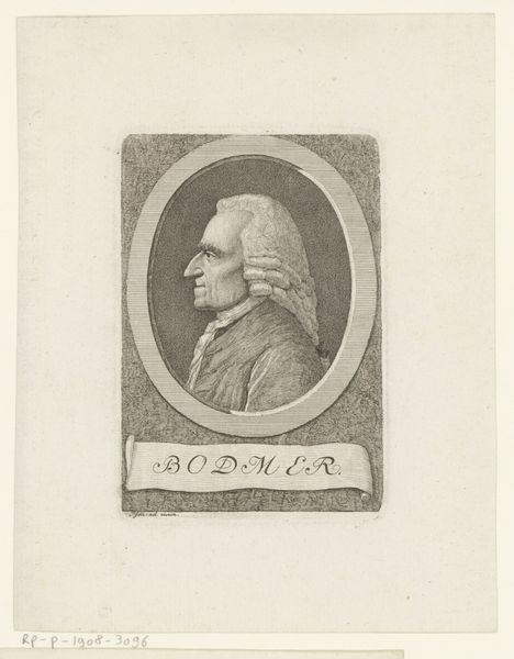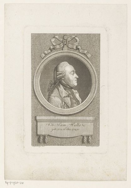 Curator: The etching before us, "Portret van een onbekende man," crafted by Leonhard Heinrich Hessell around 1789, intrigues with its intimate yet distant presence. The portrait resides here at the Rijksmuseum and presents a man whose identity is now lost to us. Editor: The immediate feeling I get is one of formality and perhaps a slight melancholy. The sepia tones and the subject’s severe profile add to this sense of detached observation. It’s a window into a world that feels simultaneously familiar and inaccessible. Curator: Absolutely, the visual language points to neoclassicism and burgeoning realism. The etched line creates a remarkable likeness while presenting an almost Roman gravitas, something so carefully designed for effect and status. Consider the circle that holds him—a symbol of wholeness, completion, perfection, but also, here, confinement. Editor: Confinement indeed. This portrait, while attempting to immortalize an individual, also locks him into the societal expectations of his time. His wig, his dress—each element speaks to the restraints of class and gender expression in the 18th century. I wonder, what freedoms, what possibilities, were denied to this man because of his station? Curator: The engraver really captured those complex signifiers of power, using light and shadow to articulate those elements you highlight so deftly. The symbolic load feels heavy. Note how the engraving also imitates the strokes of a charcoal or chalk drawing, creating an image which is both immediate and yet somewhat distanced, too. It evokes a sense of history while retaining that spark of humanity. Editor: It’s precisely this tension that I find compelling. The artist aimed for permanence and prestige, but, today, what endures is our speculation about the sitter’s internal life, and the way it speaks to ongoing debates about power, class, and representation in portraiture. Curator: Well, to walk away pondering those questions is exactly the gift that historical portraiture gives us, doesn’t it? Editor: Precisely. This seemingly straightforward portrait offers so much richness, both to investigate and interrogate.