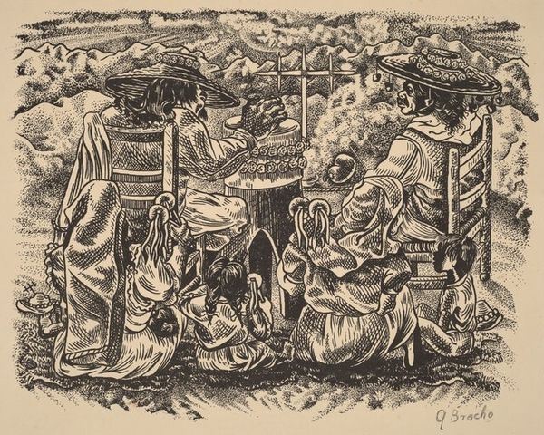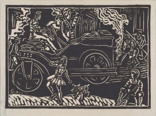 Curator: Bernece Berkman-Hunter created this print, titled "Coal Haulers," in 1938. Editor: It's strikingly stark, all blacks and greys rendered with such sharp, graphic lines. It makes you feel the grit and strain of hard labor. Curator: Absolutely. Berkman-Hunter worked in the social realism style, a popular movement in the 1930s, and used the print medium, especially graphite drawings, to document and critique the realities of working-class Americans during the Depression. Editor: And what a reality! The composition is masterful: figures draped and hunched under heavy bags; the texture is crude. It forces you to contemplate their material conditions of toiling and the social framework that keeps them confined to such back-breaking labor. Curator: This scene of genre-painting certainly speaks to the widespread struggles experienced by those living through economic hardship. The setting appears almost claustrophobic, as though they are physically boxed in, not just by labor, but by poverty and lack of opportunity. It’s a stark reflection of the politics of that time. Editor: Indeed, one can't help but think of the implications that come with portraying workers solely through their strenuous physical exertions. Even her material choices like the monochrome graphite heighten the industrial grime of the piece. Curator: Right. The print medium was deliberately chosen and had specific impact in the 30’s, making artworks more accessible. It allowed these visual messages, promoting the plight of the workers, to be disseminated far more widely and potentially galvanize social change. Editor: It also brings into question ideas of art production. Was she only making fine art prints or producing artworks designed for wider, political appeal? The blurred lines create a tension between art and craft that’s at once uncomfortable and highly relevant to the era. Curator: Considering the context within which it was made really brings "Coal Haulers" into sharper focus. I am reminded to see the human stories, struggles, and politics within even a small, monochrome print. Editor: And for me, looking closely at her graphite, really allows you to understand the ways the print was made in light of who it represents. Hopefully listeners now realize these kinds of artworks carry with them deep implications about work, class, and the human cost of production.
