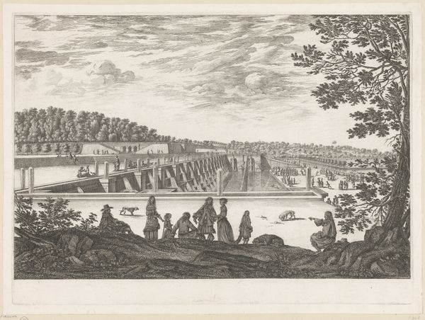 Curator: We’re looking at “Næss i Aasen Nord for Trondheim,” an etching and engraving by Elias Meyer, created sometime between 1763 and 1809. Editor: It's so still and contained; a moment captured as though from a dream. The shades of gray are calming. What story is unfolding in this serene place? Curator: Meyer depicts an agrarian settlement in Norway. We can see modest timber buildings nestled near the riverbanks and a small boat crossing. Consider the socio-political landscape. Enlightenment ideals were circulating, impacting ideas of nationhood and the common person. How did such forces interact with images of Norwegian rurality? Editor: The boat itself—such a classic vessel populated with figures; it has connotations of journey, perhaps even pilgrimage, a link to narratives as ancient as the waterways themselves. Does the settlement represent more than just simple living; is it perhaps, a kind of Arcadia? What can be read in the scale of nature and humanity here? Curator: Well, the boat’s scale reminds us that humans are but a small component of the broader landscape; an important Romantic sensibility to recall as the engraving hints at an idyllic life but without glorifying excessive leisure or aristocratic dominance. Think of land ownership, the impact of resource distribution—Meyer's Norway can be analyzed from many angles. Editor: Agreed. There's a stillness, as I said, and that grayscale contributes; but, despite all that, there are many elements in motion, literally, in the center: boaters, currents, implied narratives. Consider the arrangement of dark and light as a microcosm for human experiences. Meyer really captures a cultural symbology. Curator: Yes! Looking at "Næss i Aasen Nord for Trondheim" allows us to reflect on how seemingly simple landscapes can reveal critical perspectives related to environment, culture, and class dynamics during this transformative period in European history. Editor: I concur completely. This quiet vista speaks volumes about what we can gain from a shared symbolic and visual literacy. Thank you for unpacking all that meaning.