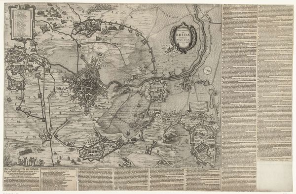 This print, “Kaart van het beleg van Breda”, was made in 1624 by an anonymous artist. It’s an etching, meaning the image was incised into a metal plate, likely copper, with a sharp tool. Ink was then applied, the surface wiped clean, and the print taken by pressing paper against the plate. The lines are crisp and precise, giving the map its detailed appearance, with the complex fortifications of Breda and surrounding landscapes carefully articulated. Printmaking was a vital medium for disseminating information and propaganda during the early modern period. The Siege of Breda was a key moment in the Eighty Years' War between the Dutch Republic and Spain, and this print served not only to document the event, but also to shape public opinion. By presenting a meticulously rendered view of the siege, the print conveys a sense of order and control, even amidst the chaos of war. Consider the labor involved, from the initial survey of the land to the skilled hand of the etcher. The print embodies the intersection of art, cartography, and politics, all mediated through the materiality of ink and paper.