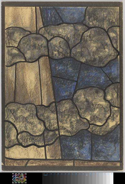 Editor: Here we have Richard Nicolaüs Roland Holst's "Design for a Window in the North Transept of the Utrecht Cathedral," created around 1934 using drawings on paper. The stark lines and geometric shapes give it a very modern, almost fractured feel. How do you interpret this work, focusing on its form? Curator: Formally speaking, we can see Holst’s piece deconstructs and then reconstructs the expected stained glass window. Observe the lines: how they create distinct planes, guiding the eye in a non-linear fashion. Are they purely decorative or, perhaps, structural? Editor: I see that. The shapes aren't traditional for a cathedral window. They’re abstract, almost jarring against the earth-toned background. It disrupts what I’d expect. Curator: Precisely. Holst seems more interested in the interplay of shapes, and the very concept of division and the visual weight certain geometrical elements seem to generate than a cohesive representational narrative. What strikes you about the coloration of this geometrical division? Editor: It's quite muted, a blend of browns and blacks. It almost drains the color, it isn't "glass-like", I would say. What kind of relationship can we build between form and materials then? Curator: Indeed. By focusing on line, shape, and color, Holst manipulates the viewer’s perception of the work, demanding we appreciate the elements themselves rather than their representational potential. Editor: That's a really interesting point. It encourages a new perspective on how to perceive a traditional form such as the window. Curator: Indeed, I hadn't noticed until now how its material execution brings up discussions about formal values, the composition creates more than it seems. Thanks to your insights.