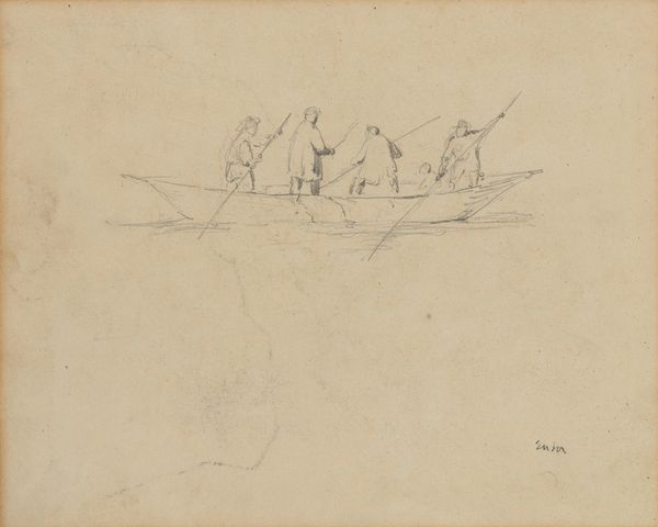 Adalbert John Volck created this etching, Marylanders Crossing the Potomac to Join the Southern Army, using dark lines on paper to render a scene imbued with historical weight. The composition is simple. We see five figures in a small boat, the texture of the water suggested by fine, repetitive strokes. Volck uses linear perspective to compress the space, heightening the sense of urgency and the risky nature of their crossing. There is one man standing, holding a rifle, anchoring the composition vertically against the horizontal pull of the river. His upright posture contrasts with the others, emphasizing the seriousness of their mission. The structural interplay of light and shadow enhances the emotional weight of the scene. The act of crossing a border, signified by the river, suggests a challenge to established norms and political boundaries. The image invites us to consider the complexities of allegiance, conflict, and the personal decisions made during times of division. While the narrative is rooted in a specific historical context, the visual language speaks to broader themes of division, transition, and resistance.