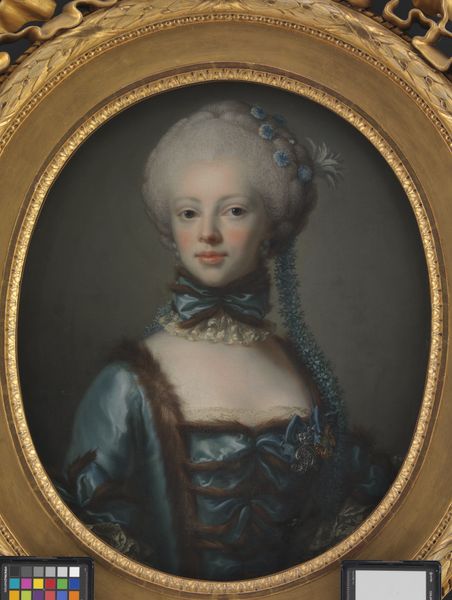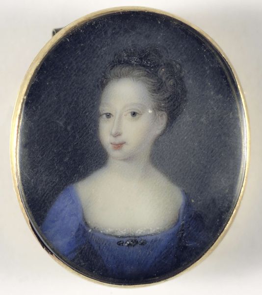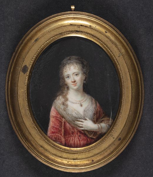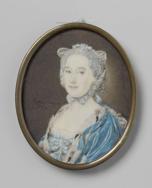 Curator: This is "Copy after Rosalba Carriera. Chastity" attributed to Cornelius Høyer, made in 1767. It's a miniature portrait rendered in watercolor on ivory, currently held here at the SMK. Editor: My first impression is just how delicate it is. The colours are so muted, it's almost like a whisper. And the tiny scale—it really invites intimacy. Curator: Absolutely. Miniatures like these were often incredibly personal objects, circulating within families or among close friends. Think about the labor involved. Painting with watercolor on ivory demands a painstaking process of layering and detail. It's not just art; it's meticulous craft. Editor: That connects with the role these objects played. Often they were commissioned as sentimental mementos. This was also at a time when ideals about femininity were intensely scrutinized and performed, think of her association with the dove, reinforcing social values around modesty. Was there an official industry behind them, a specific network of craftspeople involved? Curator: Most definitely. The Rococo style here emphasizes the taste for luxury items among elite members of society and royal patrons in this period. Workshops and ateliers often existed catering to portraiture miniature as status objects to cement alliances between notable families. Materials like ivory also had a particular commodity value for production. Editor: And how does the museum setting affect our reading of it? Is this act of exhibiting this work a preservation of gender ideals in the public imagination? It highlights that ongoing dance between individual identity and socially imposed roles. Curator: A very valid point. Displaying it in the context of the museum certainly solidifies its art historical value and also invites ongoing scrutiny about representation across the centuries. It can be interpreted and reinterpreted in so many ways, from gender expectations to material realities to personal connections. Editor: Considering it through that lens, it really underscores the ways in which art operates within both intimate spaces and broad societal structures. Curator: Precisely. A fascinating blend of personal connection and political forces.