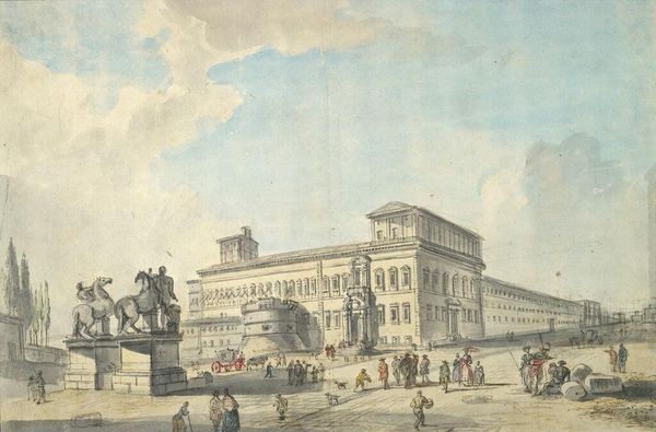 Giuseppe Gherardi's "Piazza Signoria" captures a bustling scene in one of Florence's most important public spaces, rendered with pen and brown ink and brown wash over graphite. The Piazza Signoria was not merely a backdrop; it was the stage upon which the dramas of Florentine political life played out, from grand ceremonies to public executions. The bodies that populate Gherardi's rendering, though small, speak volumes about the city's social structure. There is a clear delineation between those who appear to be merchants or laborers and the more formally dressed figures, likely members of the ruling class. Gender also subtly marks this space; women are present, but their roles seem less defined, their presence more muted than that of the men. This image invites us to consider how public spaces like the Piazza Signoria have historically been sites of both community and control, reflecting and reinforcing the power dynamics of their time. How do we reconcile the beauty and historical significance of such spaces with the knowledge that they were also stages for inequality and oppression?