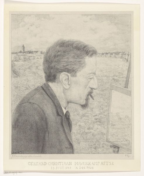 Curator: We're now looking at Arend Hendrik’s 1933 etching, “Portrait of Paul van Alff.” It resides here in the Rijksmuseum. Editor: My immediate impression is of immense gravity; the heavy lines etched into the plate seem to weigh down the subject, creating a melancholic air. Curator: It’s difficult to divorce this image from the sociopolitical landscape of the 1930s. Van Alff’s world, and by extension Hendrik's, was teetering on the brink of immense societal change. That sense of anxiety seems to seep into the very lines of the portrait. Editor: I agree. The contrast is striking, look at the precise and cross-hatched lines creating areas of intense shadow and highlights. Observe, how they delineate the contours of his face and his almost haunting eyes and how his hand emerges on the foreground! Curator: His gaze is certainly captivating and laden with lived experience. His eyes seem to penetrate you and beckon a profound internal inquiry! It makes me think of the economic hardship that might have defined Paul Van Alff and his contemporaries in the Netherlands between the wars. Editor: True, however, I am more interested in how Hendrik has chosen to convey van Alff using the etching medium. The fine lines and granular textures lend an almost tactile quality. And by choosing this somewhat tonal, graphic way of describing light, van Alff almost seems more like a weathered sculpture, worn down over time by the elements. Curator: Exactly. The etching as a medium becomes almost symbolic of the erosion of stability that individuals experienced, creating an opportunity to highlight the human side of a tumultuous period. It becomes a profound statement of human resilience amidst precarity. Editor: Ultimately, it's how the formal aspects support the representation that interests me, with those harsh contrasts enhancing that feeling of unease you mentioned, allowing for a deeper emotional resonance. Curator: It’s interesting how Hendrik situates the sitter against the landscape, to broaden the scope of personal stories into wider communal ones; his gaze moves toward the outer world of the landscape. It's this subtle connection that I find compelling. Editor: Indeed, these subtle compositional decisions shape how we relate to the portrait, adding layers of meaning through carefully structured form and meticulous details. Curator: Thank you for pointing out the subtleties and power of realism captured with etching on paper. I have truly been transported back into the angst-filled times to experience Van Alff's inner world more closely.